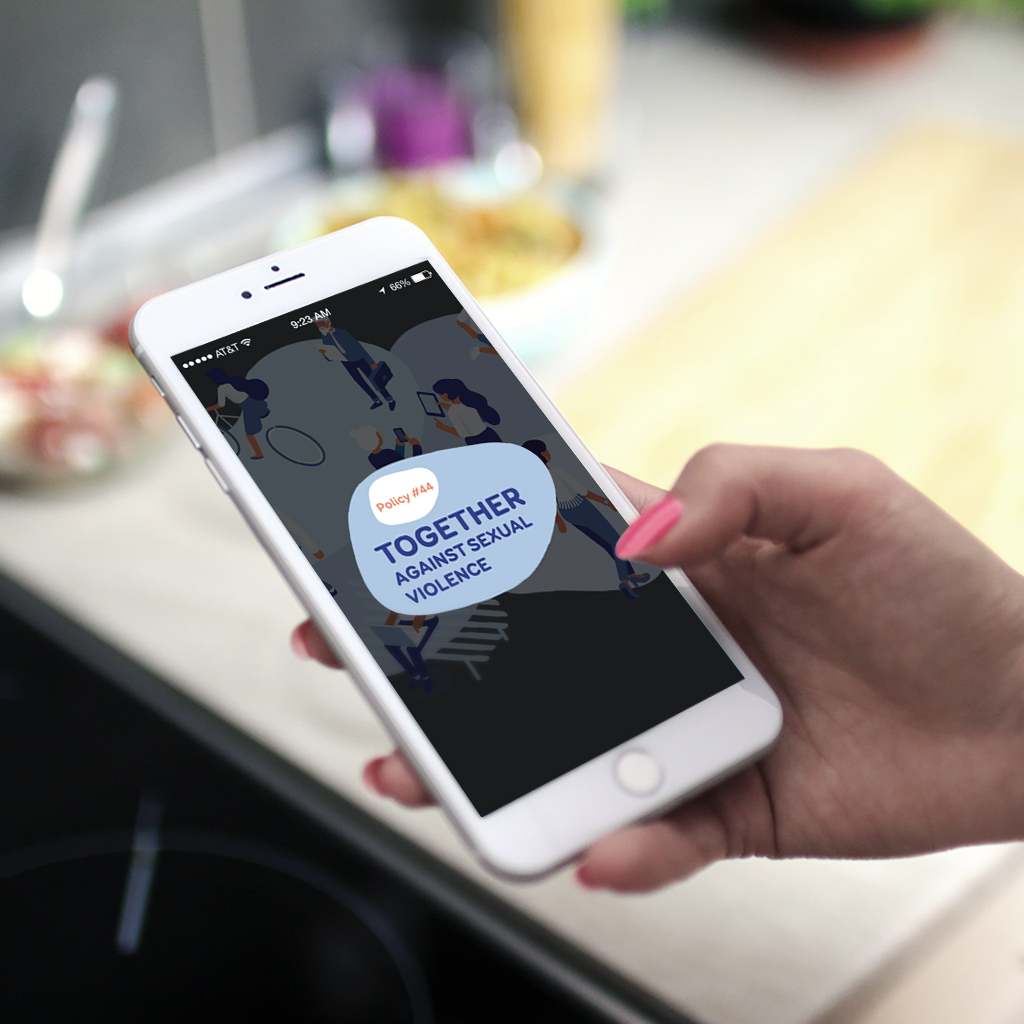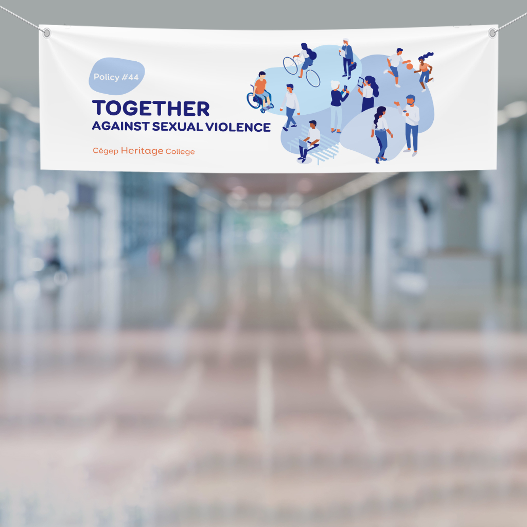 Mandat : Créer une signature et un visuel pour mobiliser la communauté interne au sujet de la violence sexuelle et de l’application de la nouvelle politique #44. Le défi était d’avoir la plus grande représentativité possible de la diversité du Cégep. Création d’une bannière, d’affiches et d’objets promotionnels.